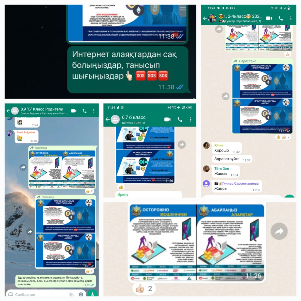 2024 жылғы 08 ақпанда "Байқаңыздар, алаяқтар!" жоспарына сәйкес оқушылардың, педагогтер мен қызметкерлер,ата-аналардың қаржылық сауаттылығын арттыру, алаяқтардан сақтану мақсатында Whatsapp чаттарына Ақтөбе облыстық прокуратурасының жадынамалары, буклеттері таратылды.