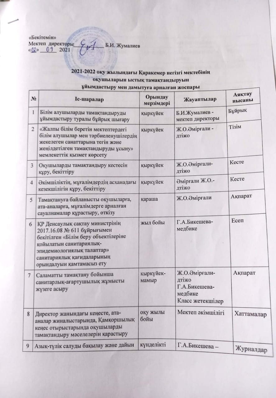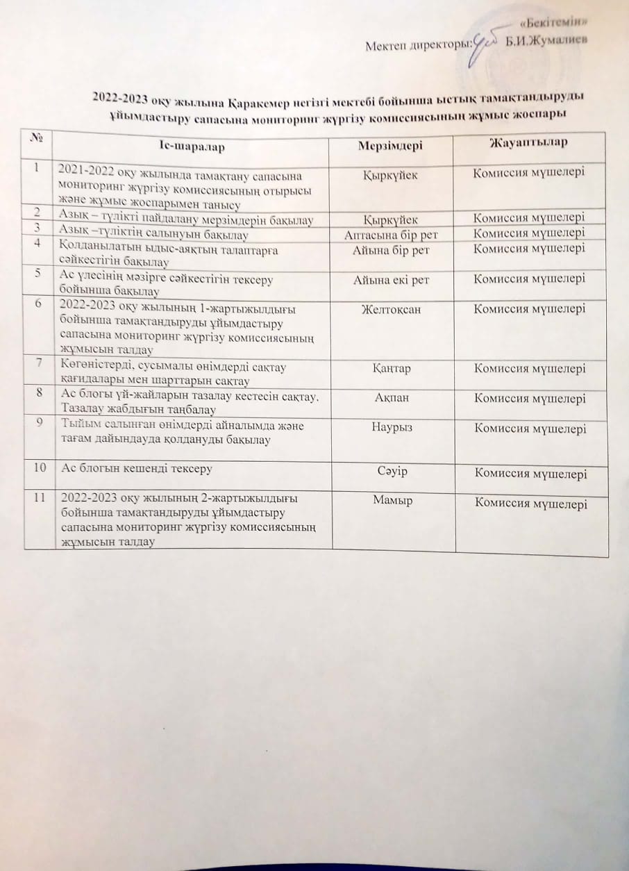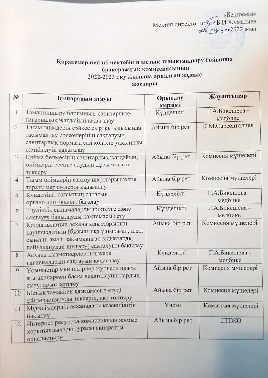 Қаракемер негізгі мектебі бойынша 2022-2023 оқу жылында оқушыларды ыстық тамақтандыруды ұйымдастыру мен дамытуға арналған жоспары