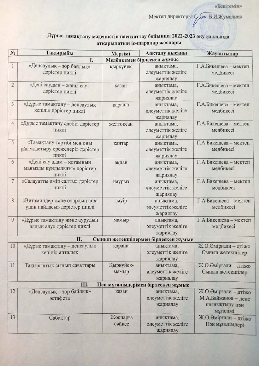 Дұрыс тамақтану мәдениетін насихаттау бойынша 2022-2023 оқу жылында атқарылатын іс-шаралар жоспары