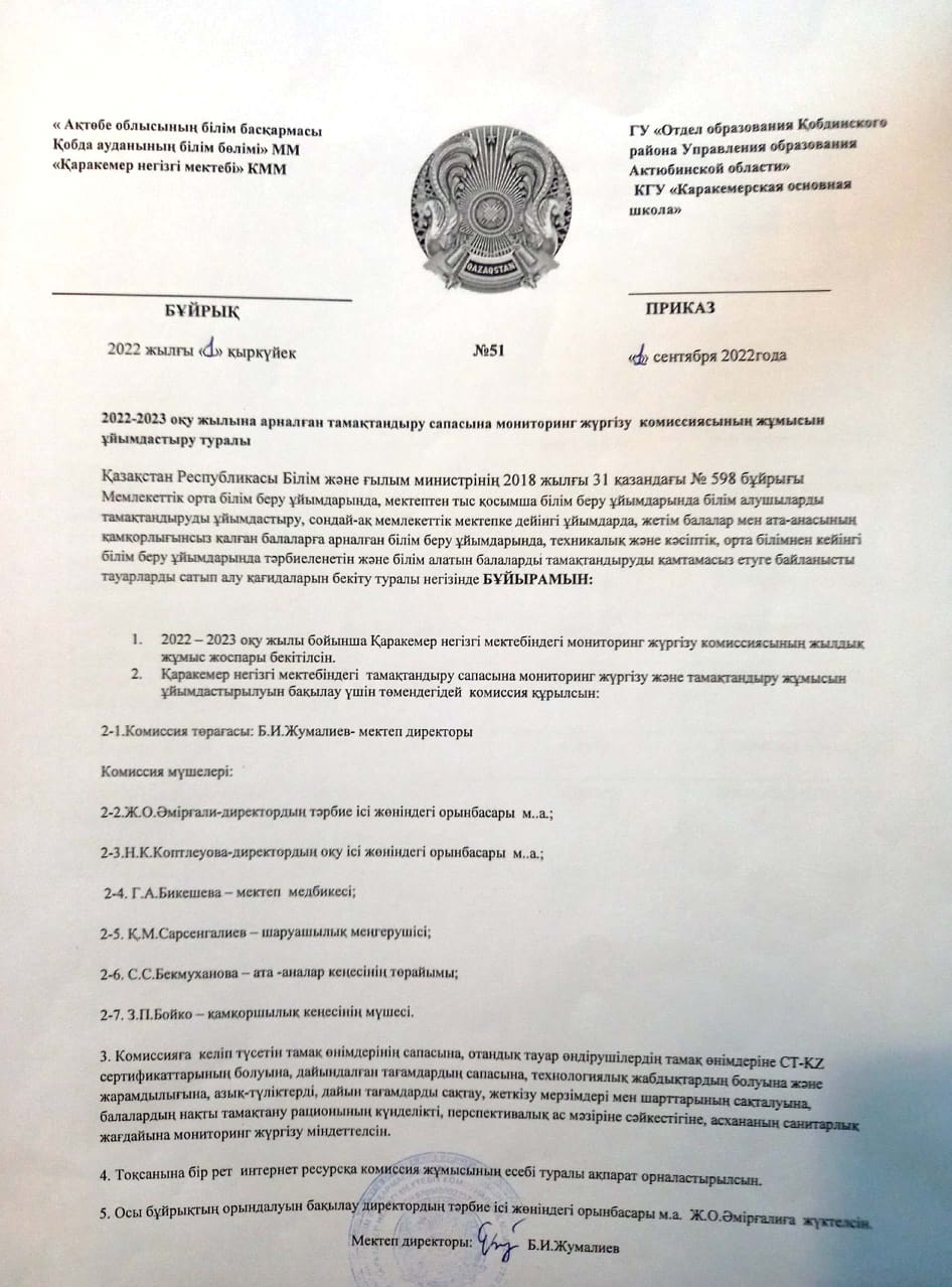 2021-2022 оқу жылына арналған тамақтандыру сапасына мониторинг жүргізу комиссиясының жұмысын ұйымдастыру туралы бұйрық