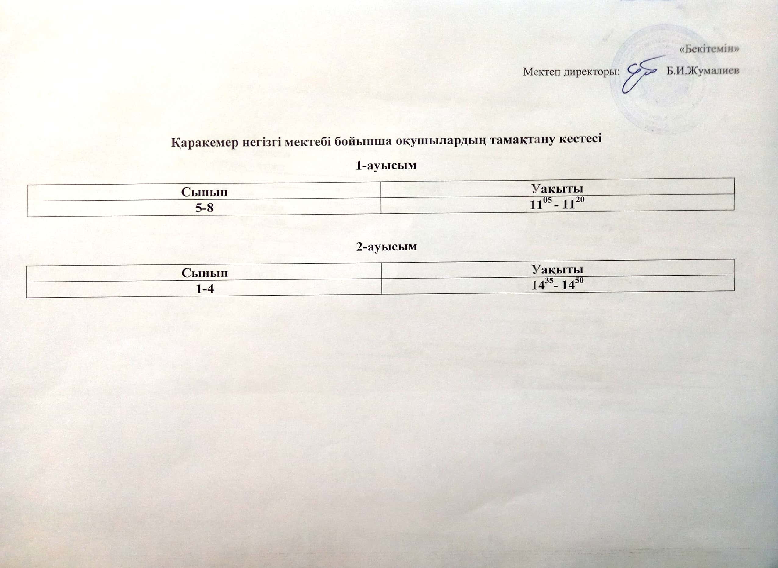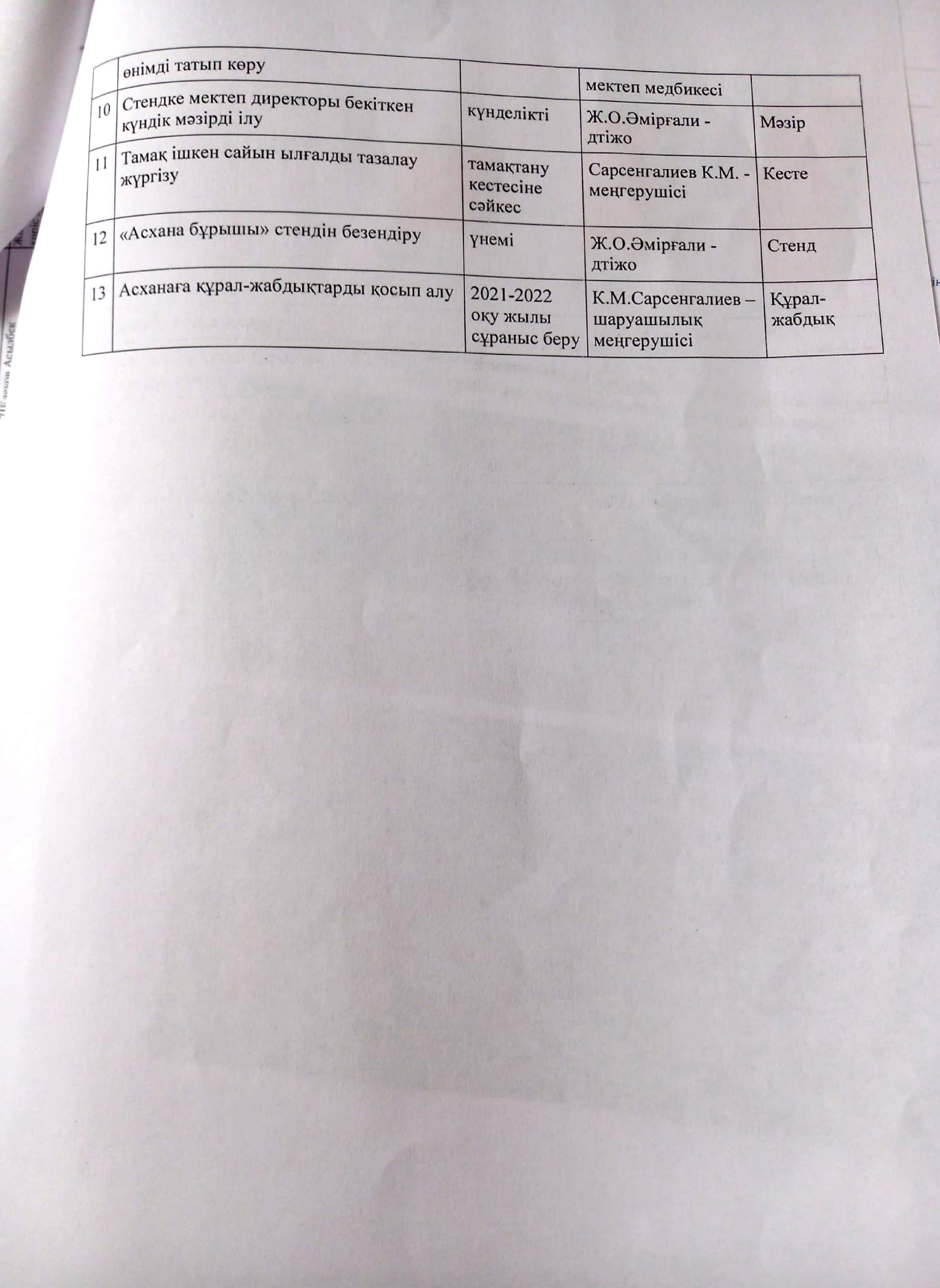 Мектеп әкімшілігі мен мұғалімдердің асханадағы кезекшілік кестесі
