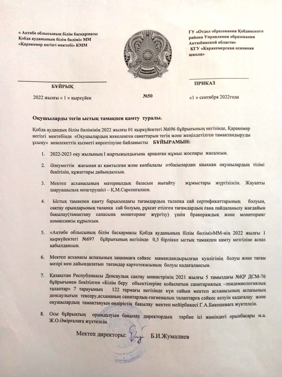Жеке санаттағы оқушыларды тегін ыстық тамақпен қамты туралы бұйрық 2024-2025
