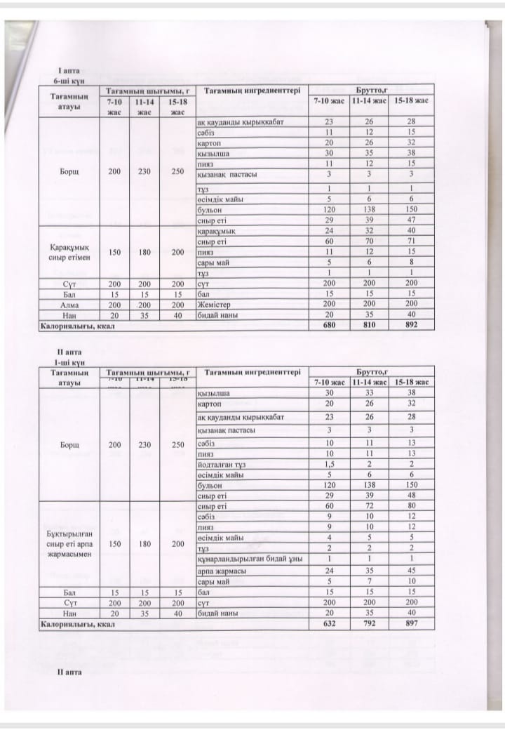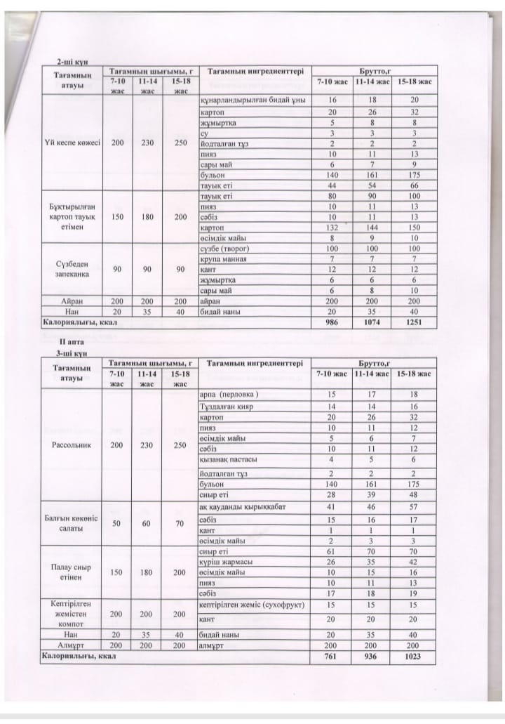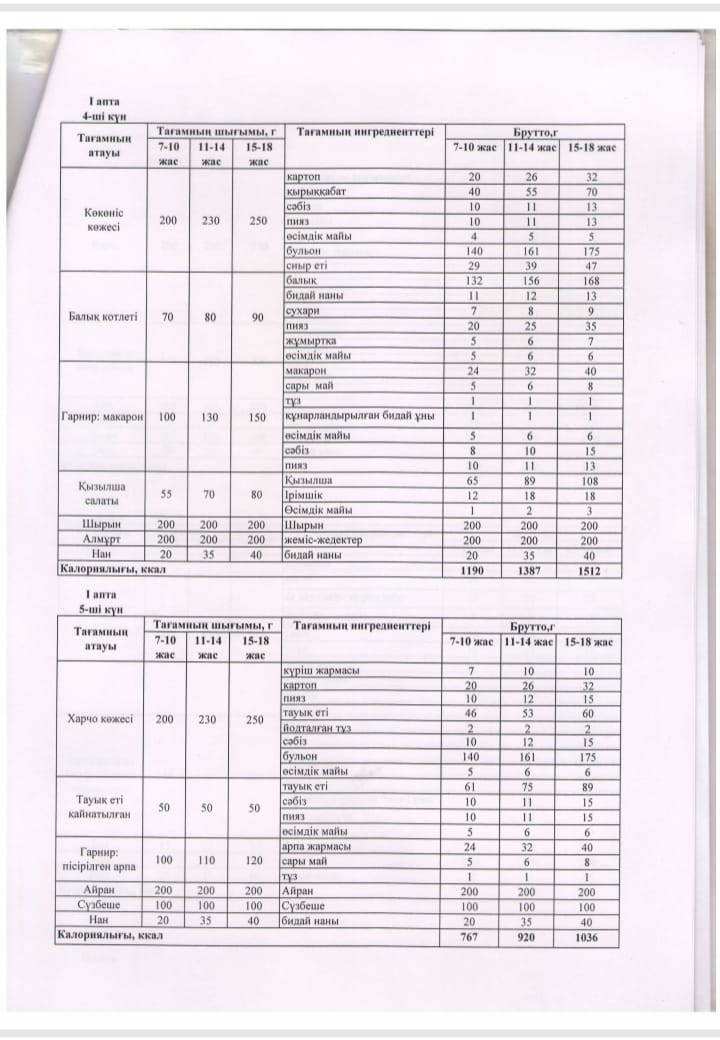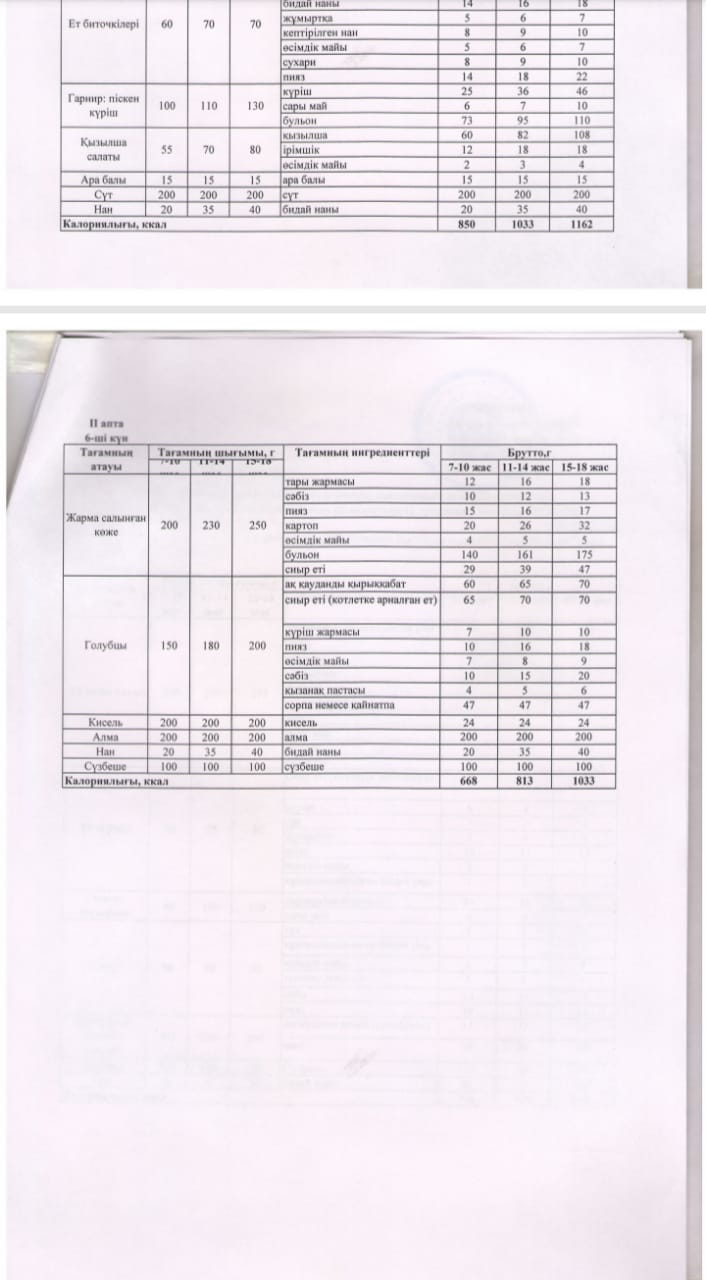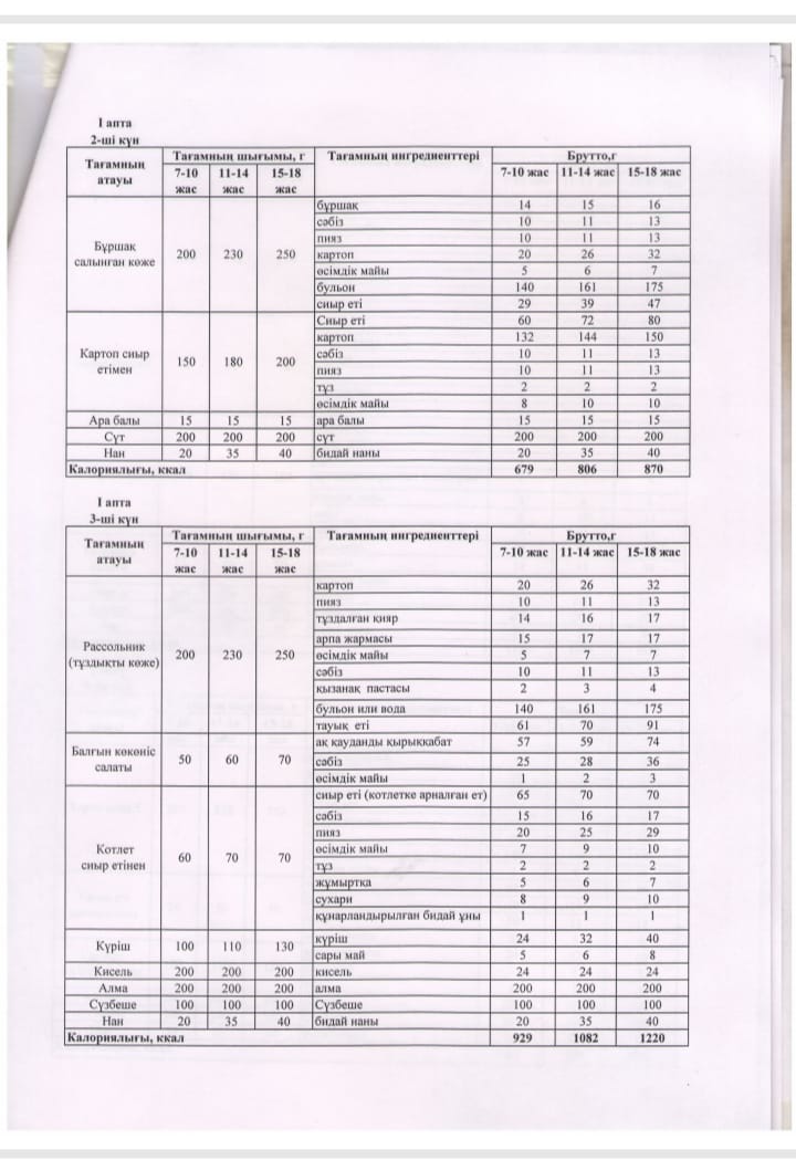 2024-2025 оқу жылы ыстық тамақ жоспар
