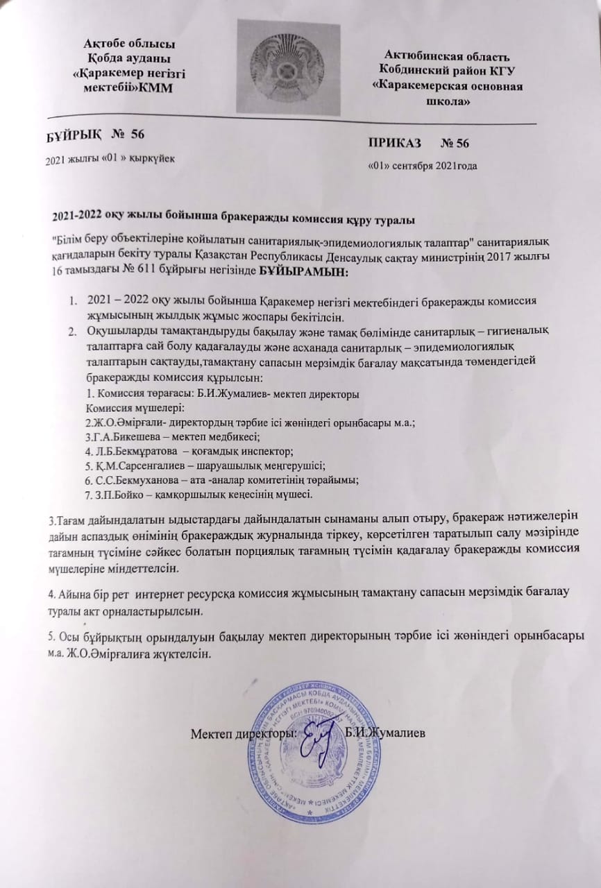 2021-2022 оқу жылы бойынша бракеражды комиссия құру туралы бұйрық
